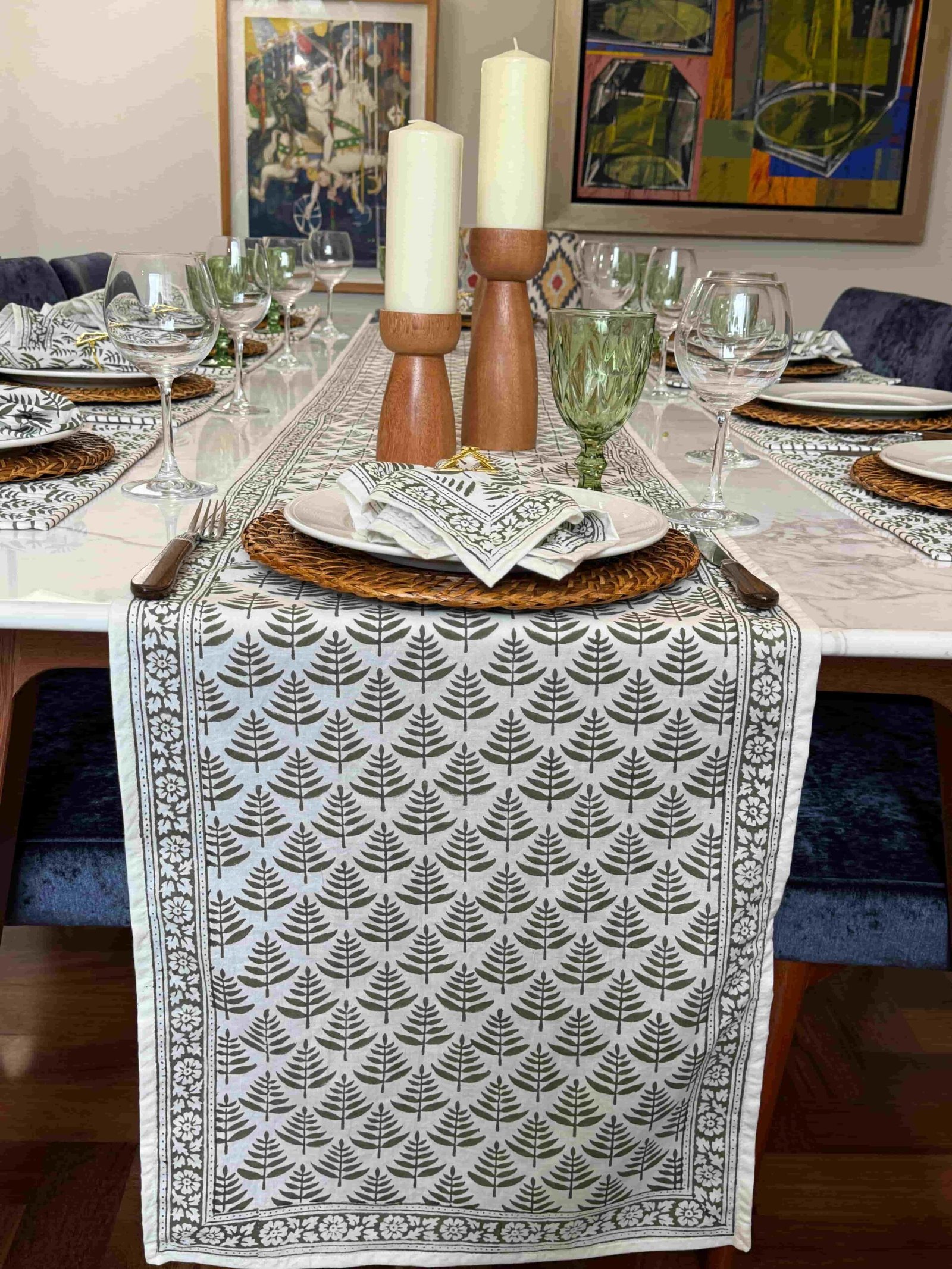 Rango de precios: desde S/ 135.15 hasta S/ 143.65Elegancia y versatilidad. Impreso artesanalmente en la India con la técnica hand block printing, su diseño de hojas verde oscuro es ideal para vestir mesas hermosas. Úsalo como acento central, en tu mesa de Navidad o para añadir sofisticación, en cualquier estación.