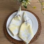 Las flores azules sobre el fondo amarillo de este individual redondo le darán un toque romántico y atemporal a tu mesa. Ideales para mesas redondas. Se combinan precioso con flores blancas, amarillas y hortensias azules.