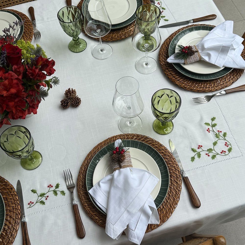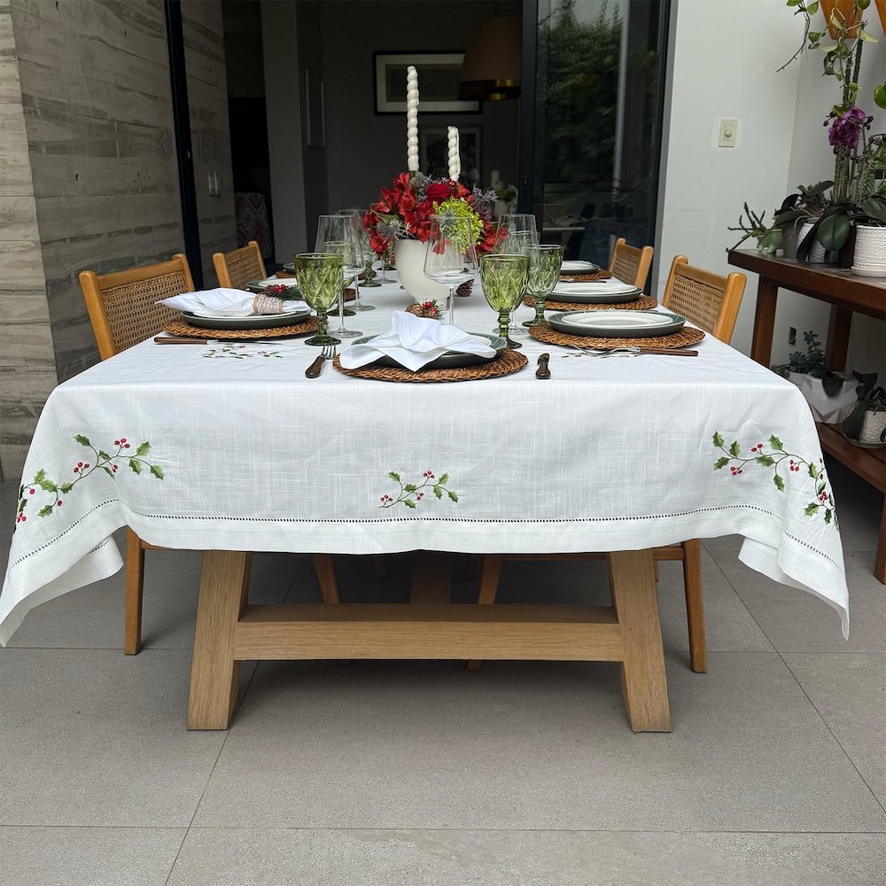 El encanto de la mantelería clásica vuelve a tu mesa. El Mantel Avignon es la pieza soñada, con su base en suave off white, realzada por finos bordados de flores de acebo y calados que aportan una delicadeza sublime. Este mantel de Navidad es perfecto para vestir tu hogar con una elegancia tradicional que perdurará.