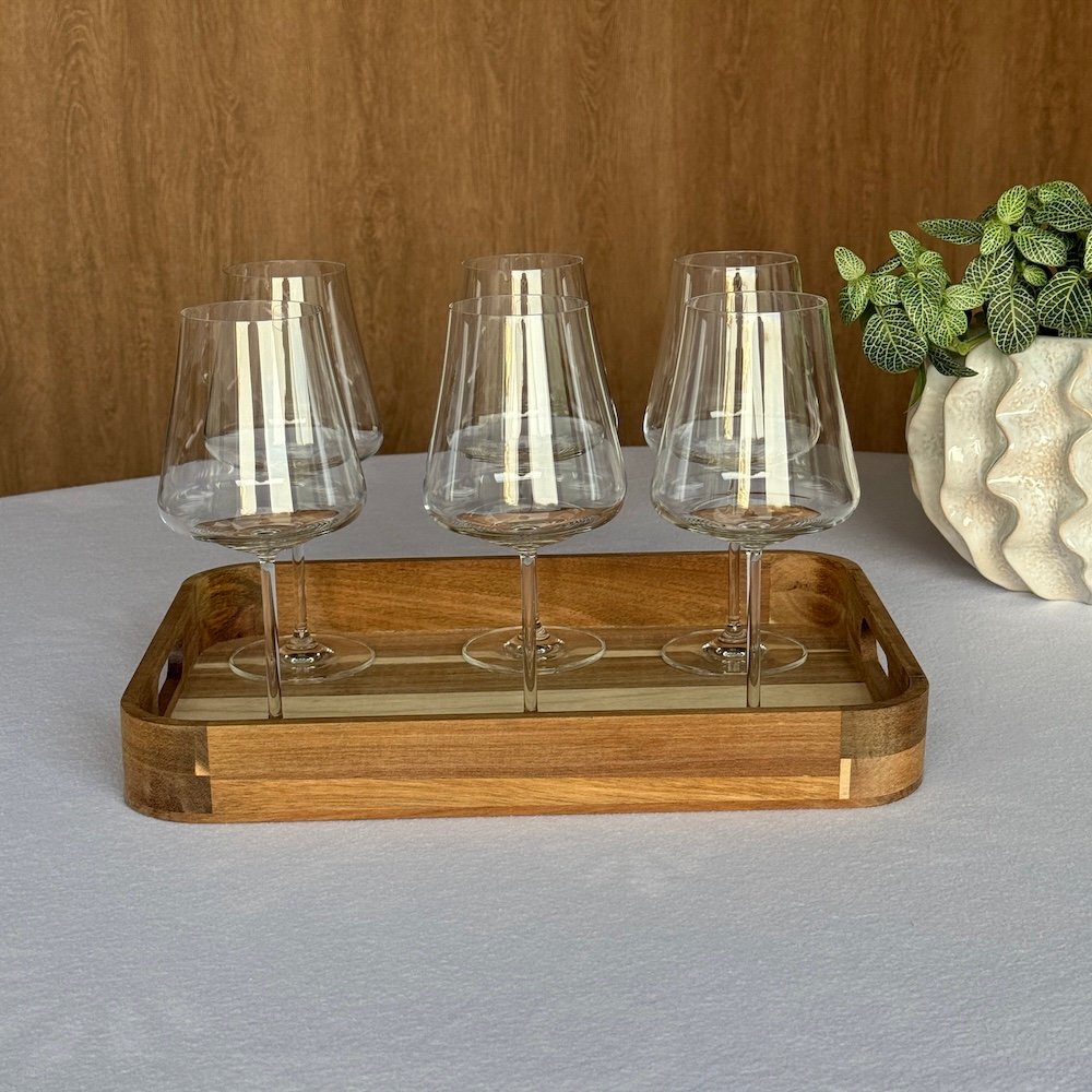 S/ 229.00Un dúo de diseño esencial. Descubre la bandeja de madera Riviera con esquinas redondeadas, una pieza moderna que añade sofisticación a cualquier mesa o bar. El set incluye una caja de copas Allure Bordeaux, muy especiales por su forma única, diseñadas para elevar tu experiencia de cata.