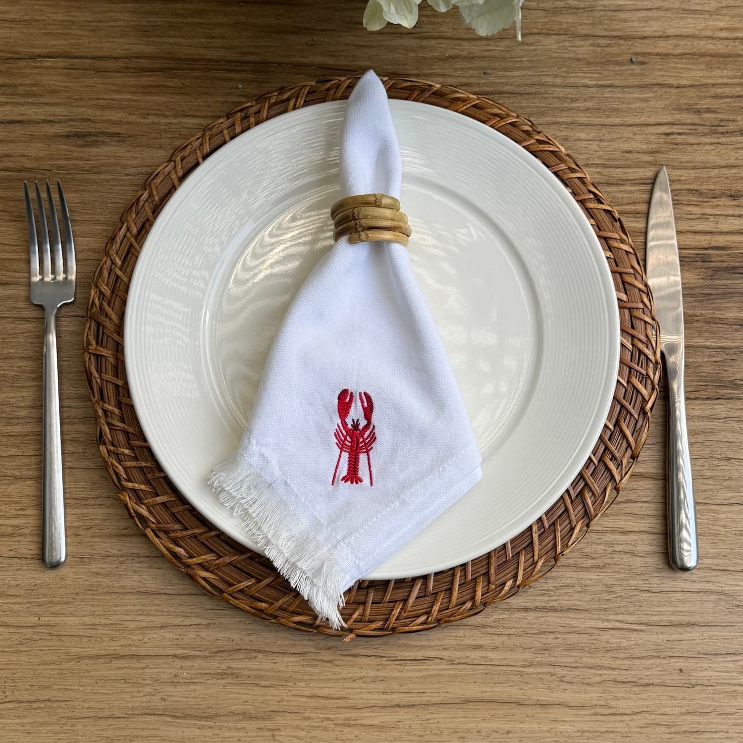 Lleva el espíritu de la costa a tu mesa con una sofisticación sin igual. Nuestra icónica servilleta Lobster se reinventa sobre un fondo de algodón blanco puro, convirtiendo el acento de color de la langosta bordada en el protagonista absoluto. El acabado desflecado en los bordes aporta una textura táctil, fluida y artesanal.