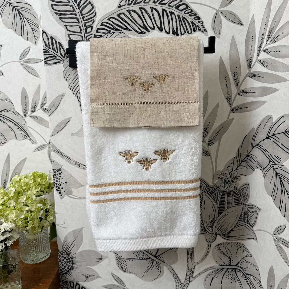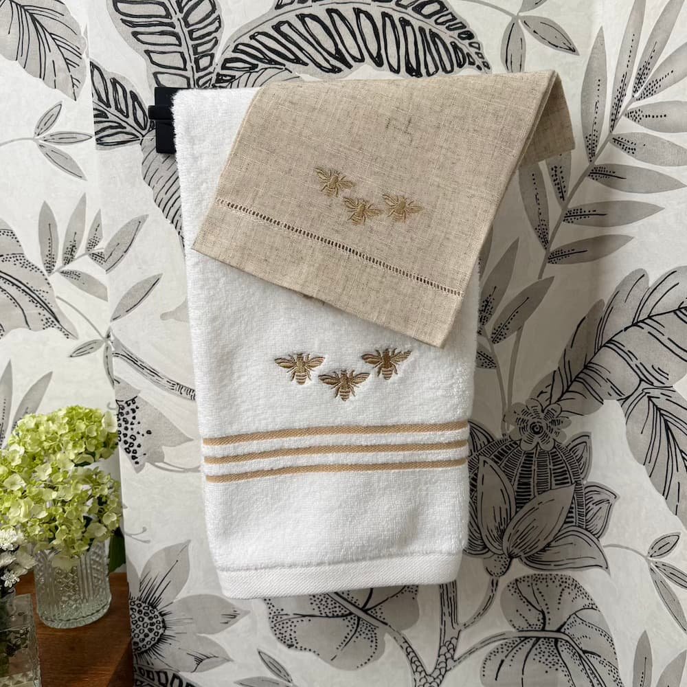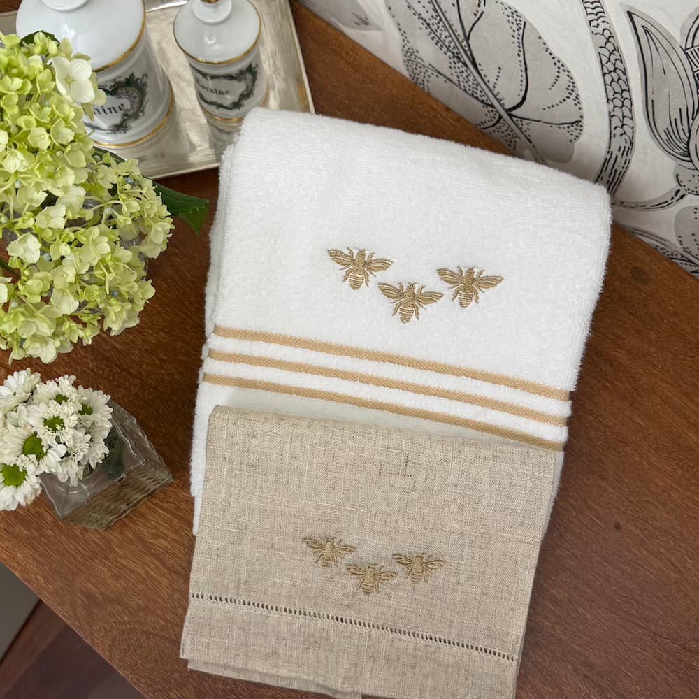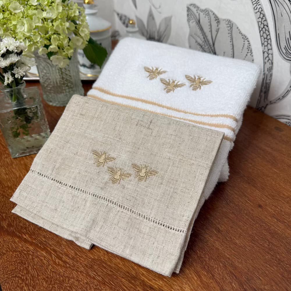 Este set es la definición perfecta de lo que buscamos en Sobremesa: piezas que no solo decoran, sino que elevan la experiencia de quienes habitan (y visitan) tu casa. El equilibrio entre la belleza del lino y la utilidad de la felpa: unidos por un delicado bordado de abejas en hilo dorado.