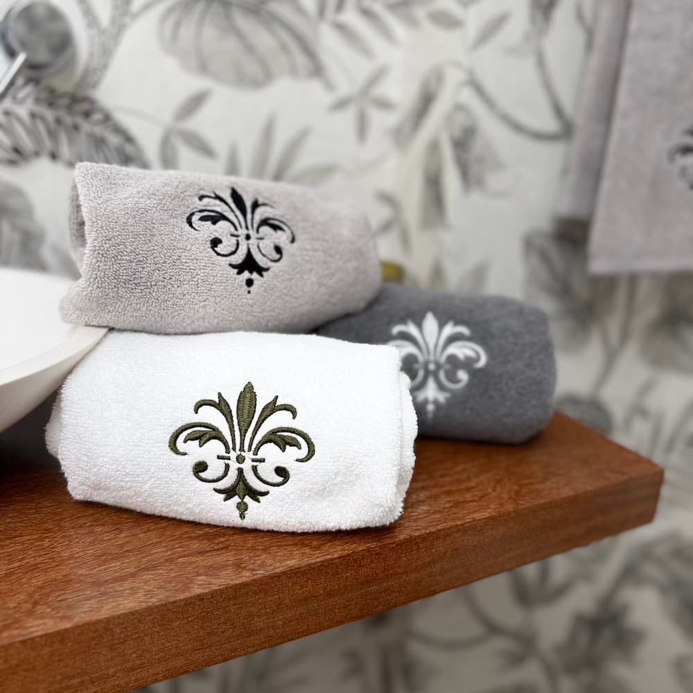 S/ 29.00Nuestra toalla de visita Firenze en color gris claro ofrece un estilo contemporáneo y refinado para tu hogar. Con un gramaje de 550 gr., esta toalla combina una absorción óptima con una suavidad superior. El diseño minimalista se realza con una elegante flor de lis bordada en hilo negro, creando un contraste dramático y moderno. Ideal para baños que buscan una estética chic y sofisticada. Sorprende a tus invitados con este toque de lujo discreto.