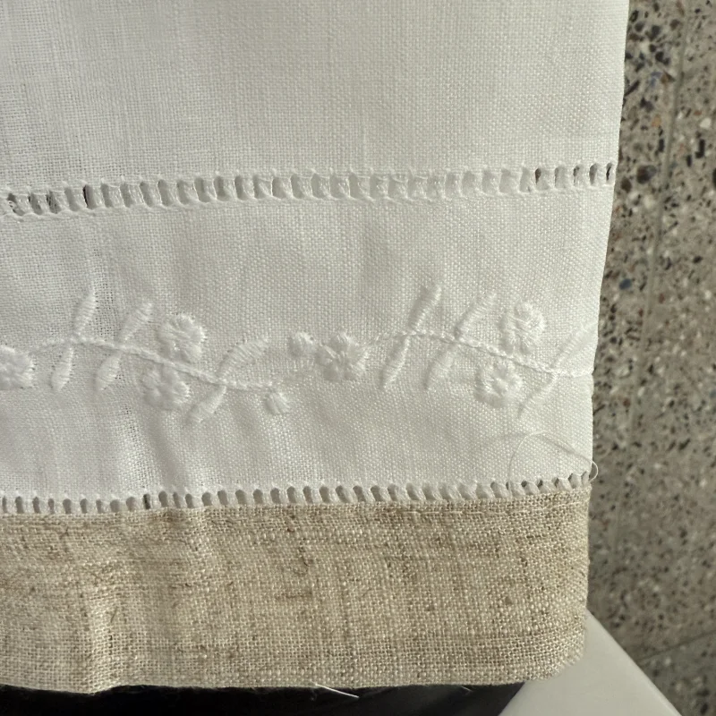 Viste tu baño de visitas con toallas de mano confeccionadas en lino. Esta en particular, combina dos telas y tiene una franja de flores bordadas que le da un toque muy elegante.