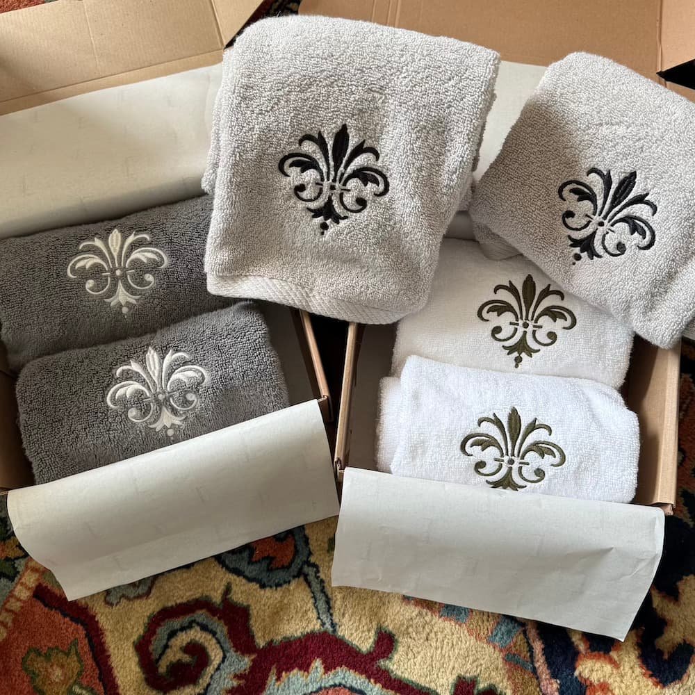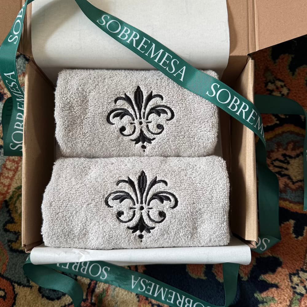 Nuestra toalla de visita Firenze en color gris claro ofrece un estilo contemporáneo y refinado para tu hogar. Con un gramaje de 550 gr., esta toalla combina una absorción óptima con una suavidad superior. El diseño minimalista se realza con una elegante flor de lis bordada en hilo negro, creando un contraste dramático y moderno. Ideal para baños que buscan una estética chic y sofisticada. Sorprende a tus invitados con este toque de lujo discreto.