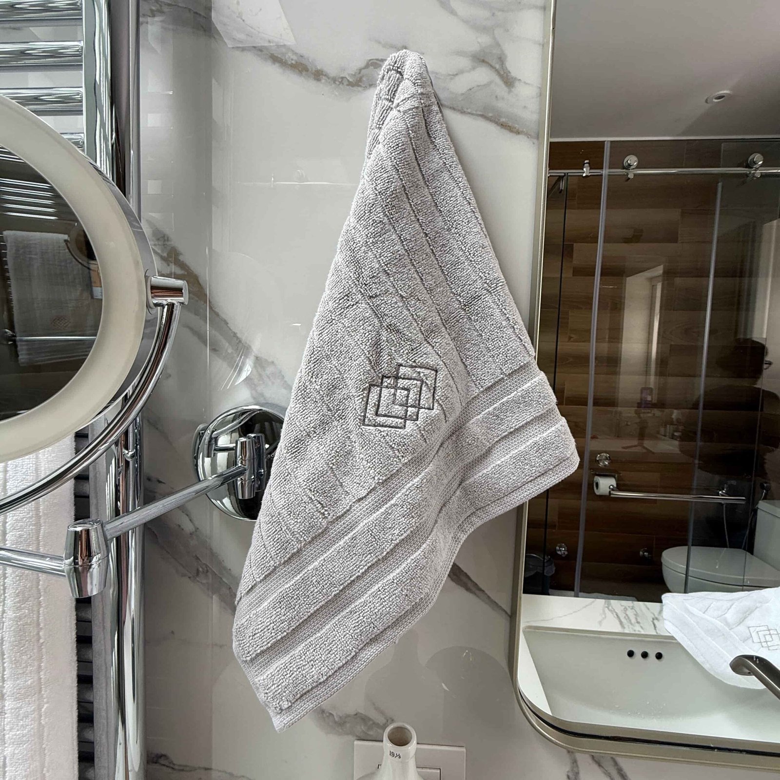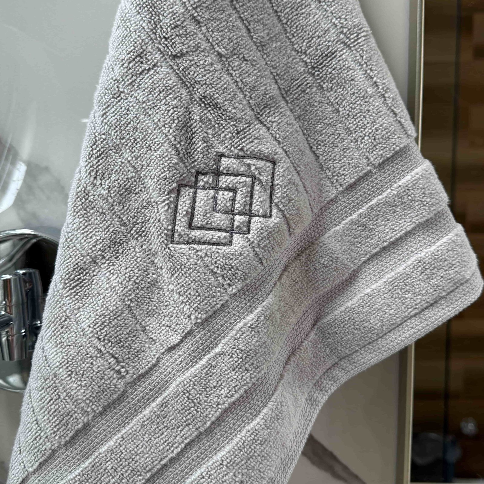Envuelve tu cuerpo en la máxima suavidad. Nuestra toalla «Rombos» está confeccionada en 100% algodón de 600 gramos, lo que garantiza una absorción superior y una sensación de confort inigualable. Su tamaño extra grande ofrece una cobertura total, transformando tu rutina diaria en una experiencia de spa. El elegante diseño en color gris se realza con un delicado bordado de tres rombos en tono gris, añadiendo un toque de sofisticación atemporal a tu baño.